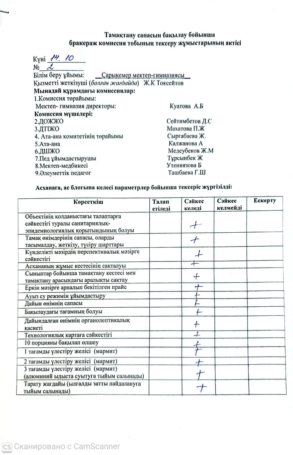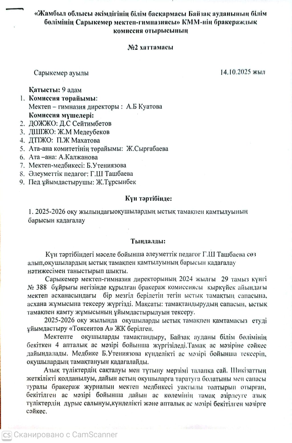 Тамақтану сапасын бақылау бойынша бракераж комиссиясының жұмысы.Қазан 2025-2026