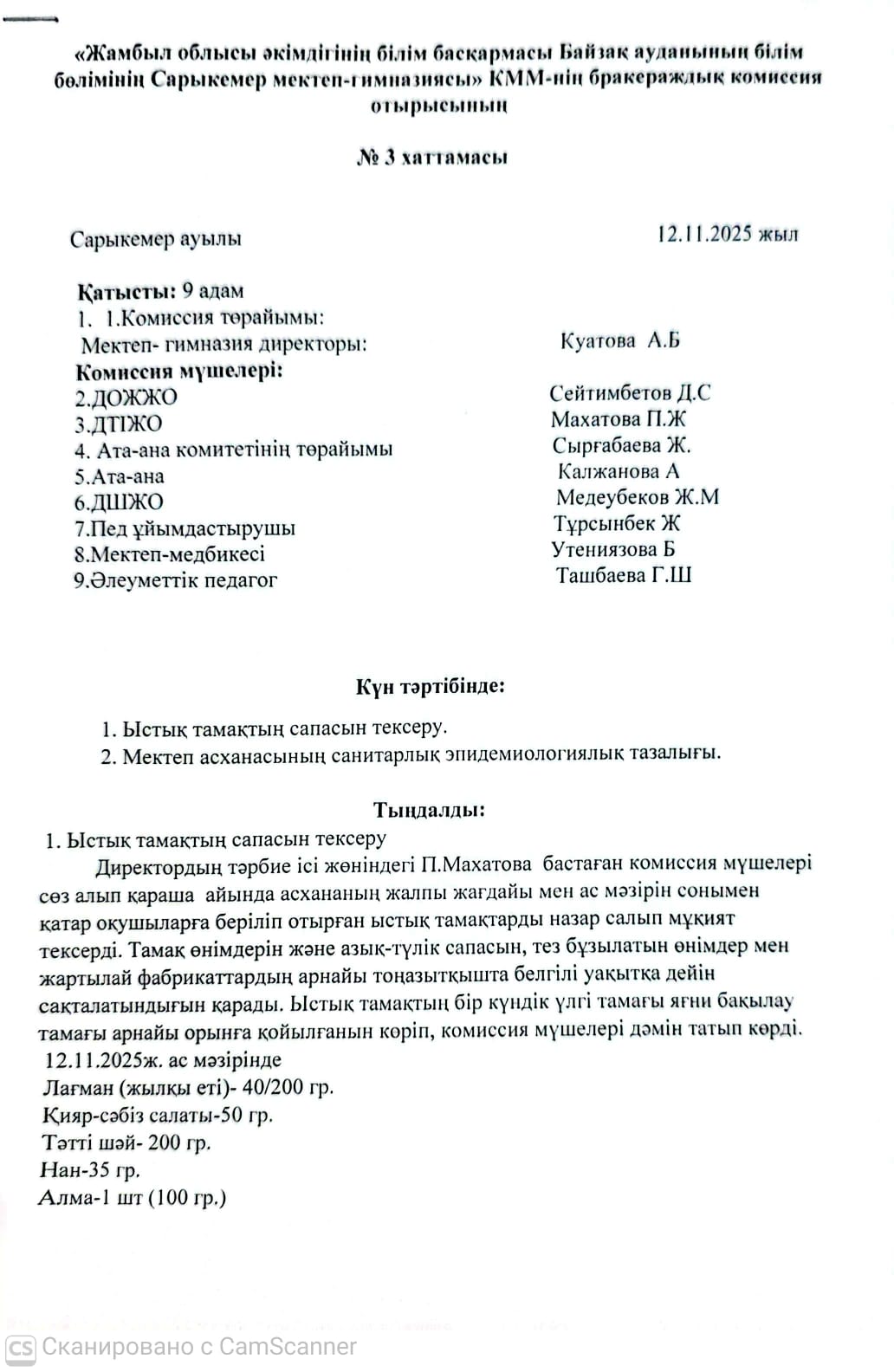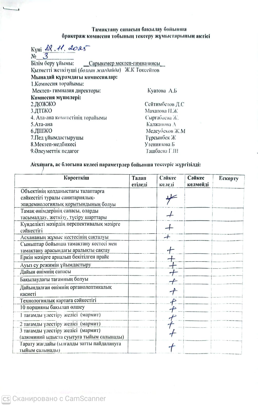 Тамақтану сапасын бақылау бойынша бракераж комиссиясының жұмысы.Қазан 2025-2026